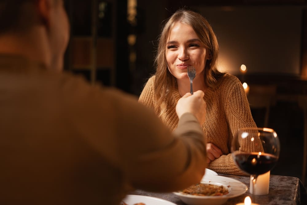 Happy,Couple,Having,Romantic,Dinner,In,Restaurant,,Eating,And,Drinking